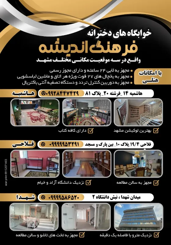 در مشهد، انواع مختلفی از خوابگاه دخترانه برای پاسخگویی به نیازهای دانشجویان و کارمندان وجود دارد: