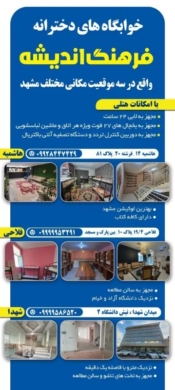 خواندن نظرات و تجربیات دیگران در پلتفرمهای مختلف مانند خوابگاه دخترانه مشهد دیوار یا وبسایتهای تخصصی، میتواند کمک زیادی به انتخاب درست کند و دیدگاهی واقعیتر از شرایط اقامتی ارائه دهد. دیدن عکس خوابگاه دخترانه مشهد نیز میتواند به شما کمک کند.
